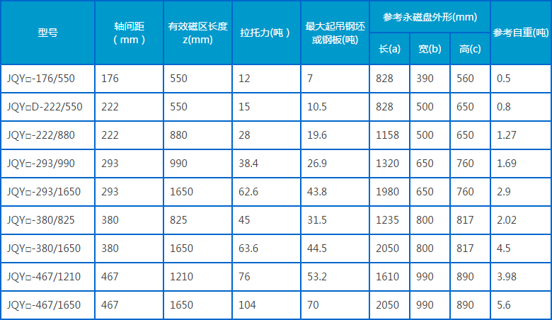 注:1、按起重永磁鐵所吸吊的物料溫度分